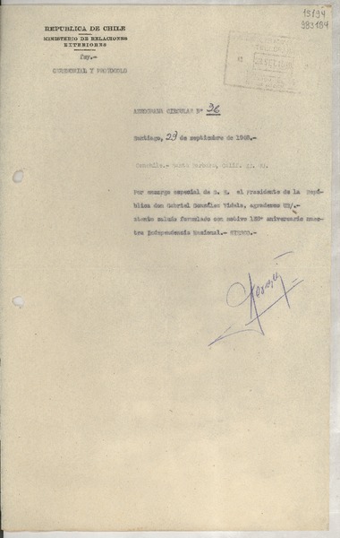 [Circular] N° 02400-1713, [1948] sept. 2, Nueva York, [EE.UU.] [a] Gabriela Mistral, Cónsul de Chile, Santa Bárbara, [EE.UU.] [manuscrito] Alfonso Grez Cónsul General.