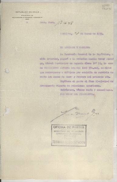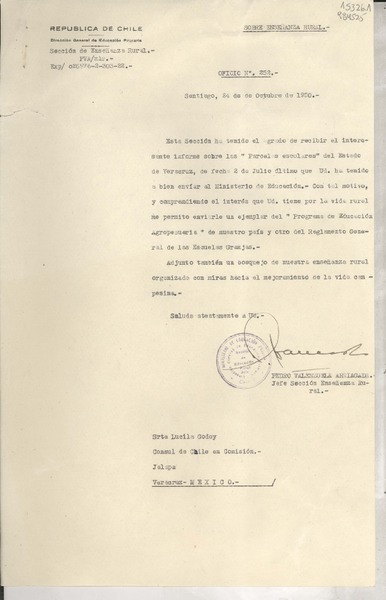 [Oficio] N° 9755, 1950 feb. 6, México, D.F., México [a la] Señorita, Gabriela Mistral, Cónsul de Chile en Comisión, Jalapa, Ver., [México] [manuscrito] / Enrique Gajardo V. Embajador de Chile.