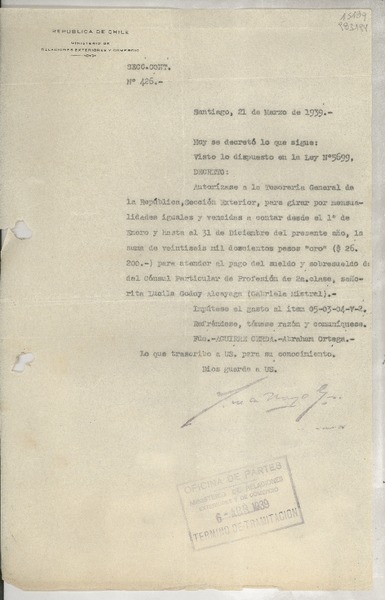 Santiago, Chile [a] Salvador Reyes, Cónsul en Paris Letras Patentes [Cartas credenciales], 1939 marzo 21, [manuscrito] República de Chile.