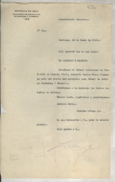 Ortega Aguayo, Abraham - Manuscritos chilenos - Presidentes - Aguirre Cerda, Pedro - Diplomáticos - Documentos consulares - Cónsules - Reyes, Salvador