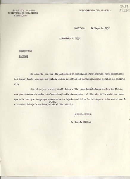 Aerograma N° 1853, 1952 mayo 15, Santiago [a] CongeChile, Nápoles [manuscrito] F. García Oldini.