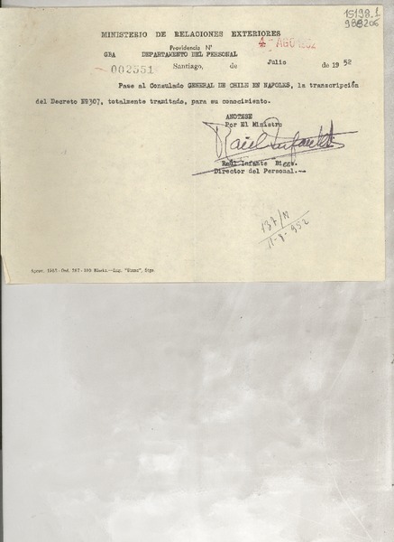 Circular N° 03244-51, 1948 dic. 22, Nueva York, [EE.UU.] [a los] [Señores Cónsules de Chile en EE.UU. y Puerto Rico] [manuscrito] Alfonso Grez Cónsul General.