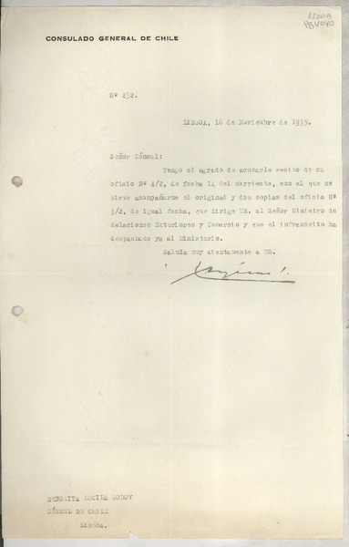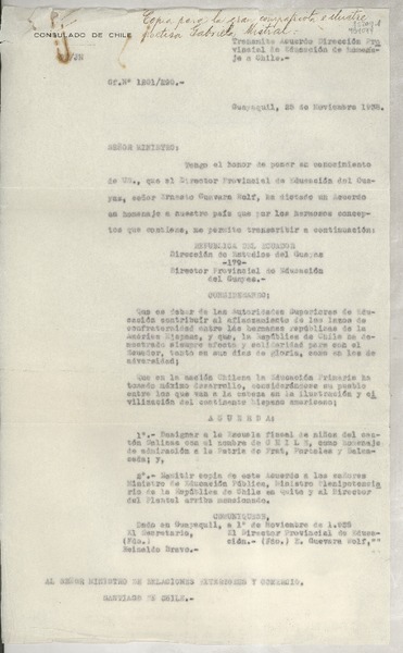 Of. N° 1201290, 1938 nov. 25, Guayaquil, [Ecuador] [al] Señor Ministro de Relaciones Exteriores y Comercio, Santiago de Chile [manuscrito] / Pedro Ramírez Soto Cónsul de Chile en Guayaquil.