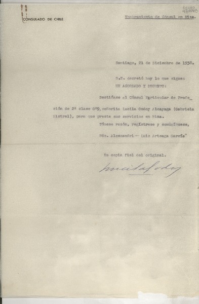 [Oficio] N° 7725, 1947 dic. 20, Santa Barbara, [Estados Unidos] [al] Señor Cónsul General de Chile en Nueva York [manuscrito] / Lucila Godoy.