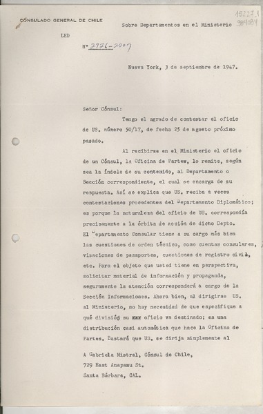 [Circular] N° 2126-2009, 1947 sept. 3, New York, [Estados Unidos] [a] Gabriela Mistral, Cónsul de Chile, 729 East Anapamu St., Santa Bárbara, Cal. [manuscrito] Jorge Hayler.
