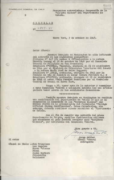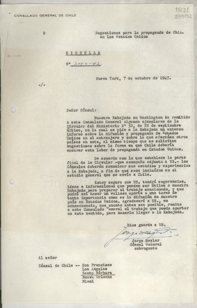 Circular N° 3052-42, 1947 oct. 7, Nueva York, [Estados Unidos] [al] señor Cónsul de Chile, Santa Bárbara [manuscrito] Jorge Hayler.