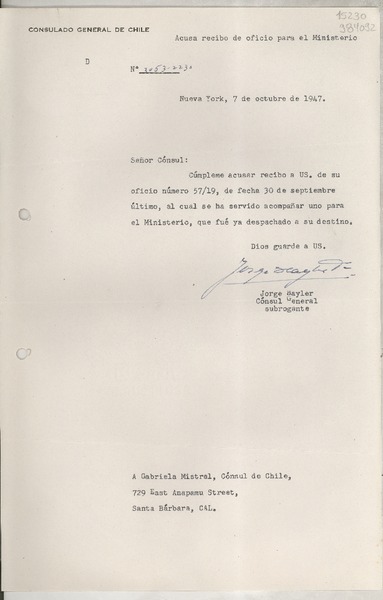 [Circular] N° 3053-2230, 1947 oct. 7, New York, [Estados Unidos] [a] Gabriela Mistral, Cónsul de Chile, 729 East Anapamu Street, Santa Bárbara, Cal. [manuscrito] Jorge Hayler.