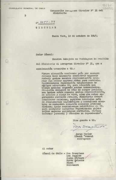 Circular N° 3091-44, 1947 oct. 10, Nueva York, [Estados Unidos] [al] señor Cónsul de Chile, Santa Bárbara [manuscrito] Jorge Hayler.