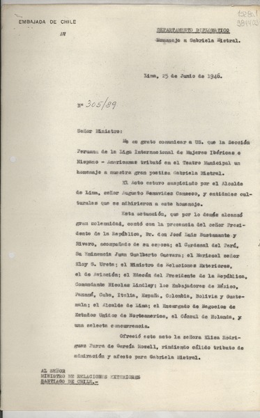 [Circular] N° 30589, 1946 jun. 25, Lima, [Perú] [a] Señor Ministro de Relaciones Exteriores, Santiago de Chile [manuscrito] / José Francisco Urrejola.