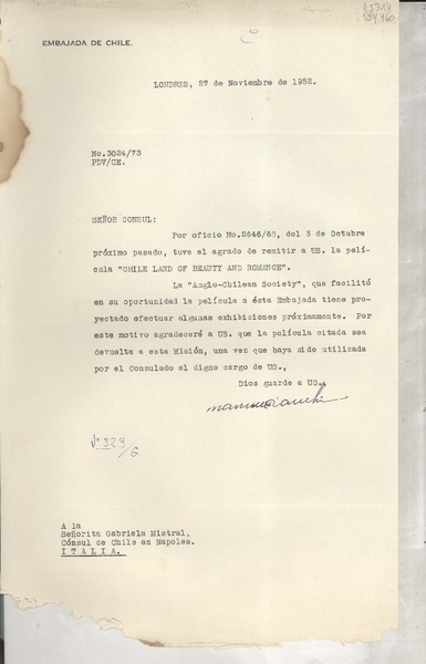 [Circular] N° 3336-2439, 1947 oct. 31, Nueva York, [Estados Unidos] [al] señor Cónsul de Chile (Gabriela Mistral), Santa Barbara, Cal. [manuscrito] Alfonso Grez.