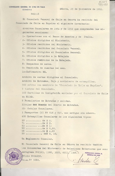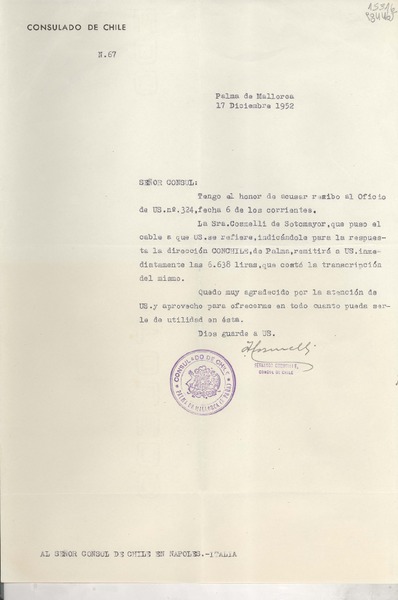[Oficio] N° 67, 1952 dic. 17, Palma de Mallorca, [España] [al] Señor Cónsul de Chile en Nápoles, Italia [manuscrito] Fernando Cosmelli E., Cónsul de Chile.
