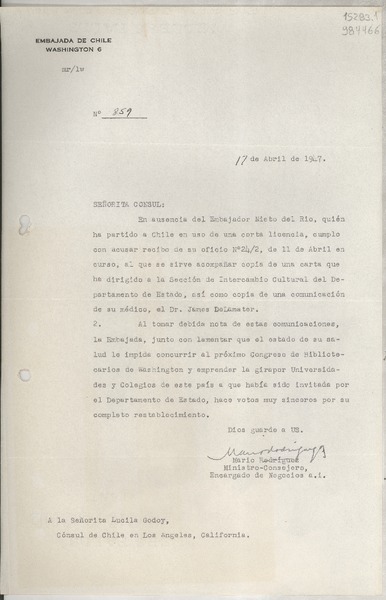 [Oficio] N° 734, 1947 dic. 18, Santa Barbara, [Estados Unidos] [al] Señor Embajador de Chile en Washington [manuscrito] / Lucila Godoy.