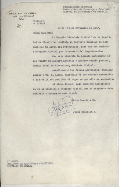 Mistral, Gabriela - Correspondencia - Manuscritos chilenos - Diplomáticos - Hayler, Jorge