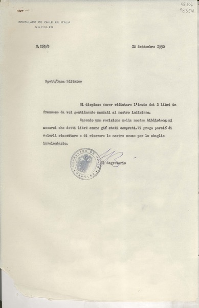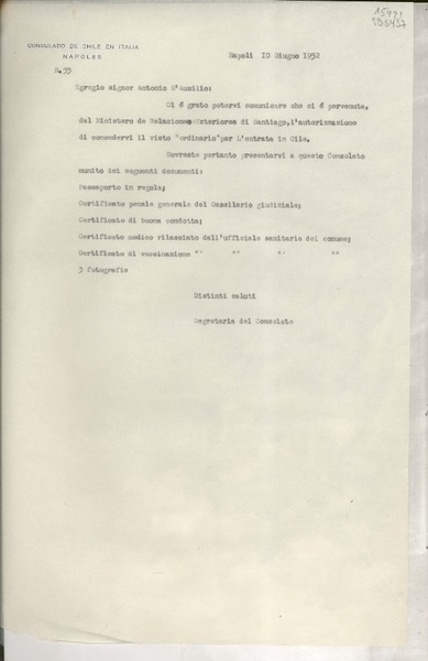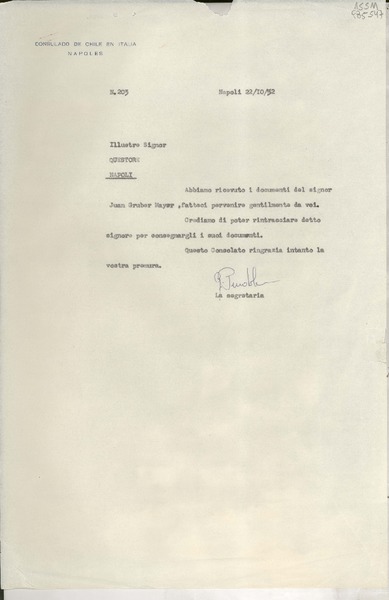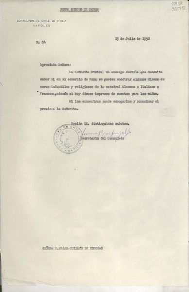 [Oficio] N° 84, 1952 jul. 15, Nápoles, Italia [a] Señora Palma Guillén de Nicolau [manuscrito] Secretario del Consulado.