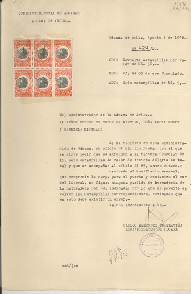 [Oficio] N° 65, 1952, Nápoles, [Italia] [al] Sr. Jefe de la Aduana, Arica, [Chile] [manuscrito] Lucila Godoy (Gabriela Mistral), Cónsul de Chile en Nápoles.