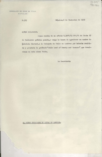 [Oficio] N° 78, 1952 jul. 1, Nápoles, Italia [al] Señor Tesorero General de la República de Chile [manuscrito] Lucila Godoy, Cónsul de Chile.