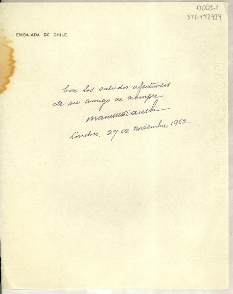 [Carta] 1952 nov.27, Londres, [Reino Unido] [a] [Gabriela Mistral] [manuscrito] Manuel Bianchi.