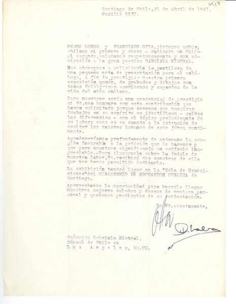 [Carta] 1947 abr. 21, Santiago, Chile [a] Gabriela Mistral, Los Angeles, EE.UU. [manuscrito] Pedro Lobos, Francisco Otta.