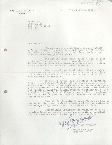 [Carta] 1957 julio 1, Roma, Italia [a] Juan Mujica de la Fuente [manuscrito] Rodolfo Opazo Bernales.