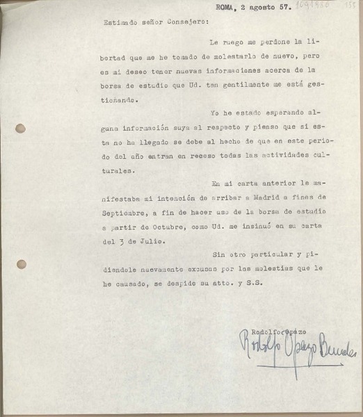 [Carta] 1957 agosto 2, Roma, Italia [a] Juan Mujica de la Fuente [manuscrito] Rodolfo Opazo Bernales.