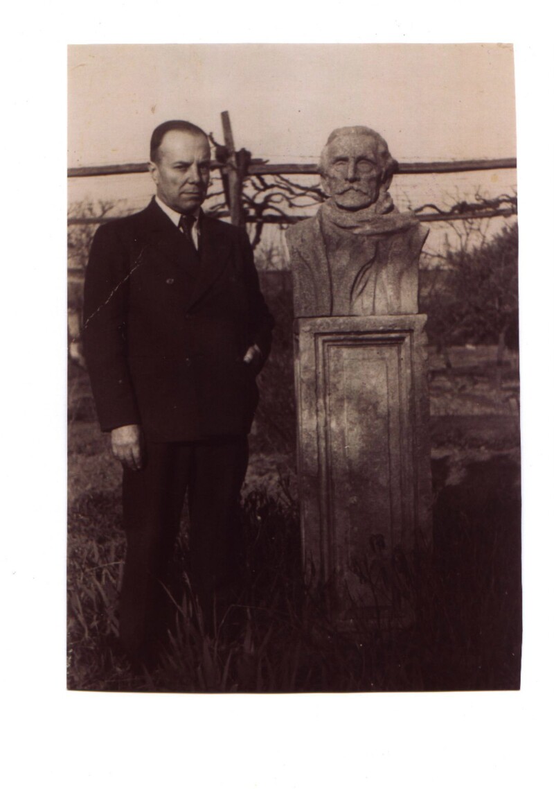 Pedro Prado al lado del busto del pintor Juan Francisco González [Fotografía].