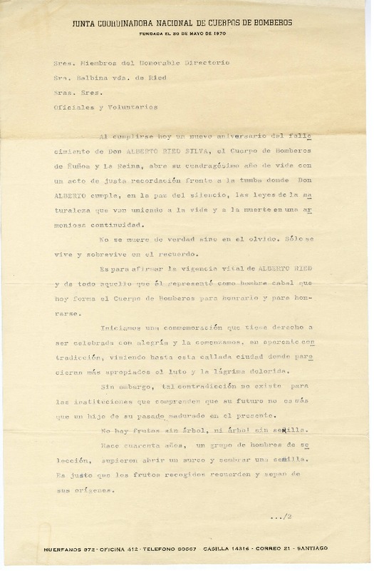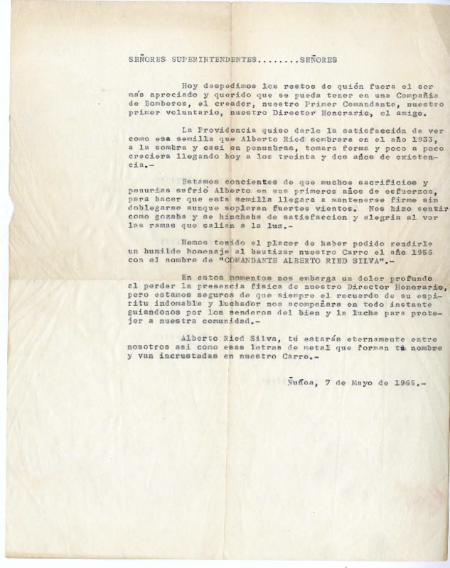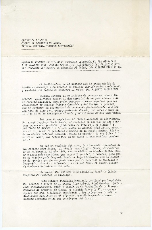 [Homenaje a Alberto Ried] [manuscrito] Compañía de bomberos de Nuñoa.