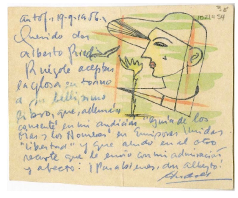 [Tarjeta] 1956 septiembre 9, Antofagasta, Chile [a] Alberto Ried, Santiago, Chile [manuscrito] Andrés Sabella.
