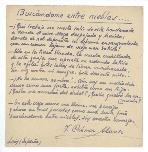 [Buscándome entre nieblas...] [manuscrito] Victoriano Crémer Alonso.