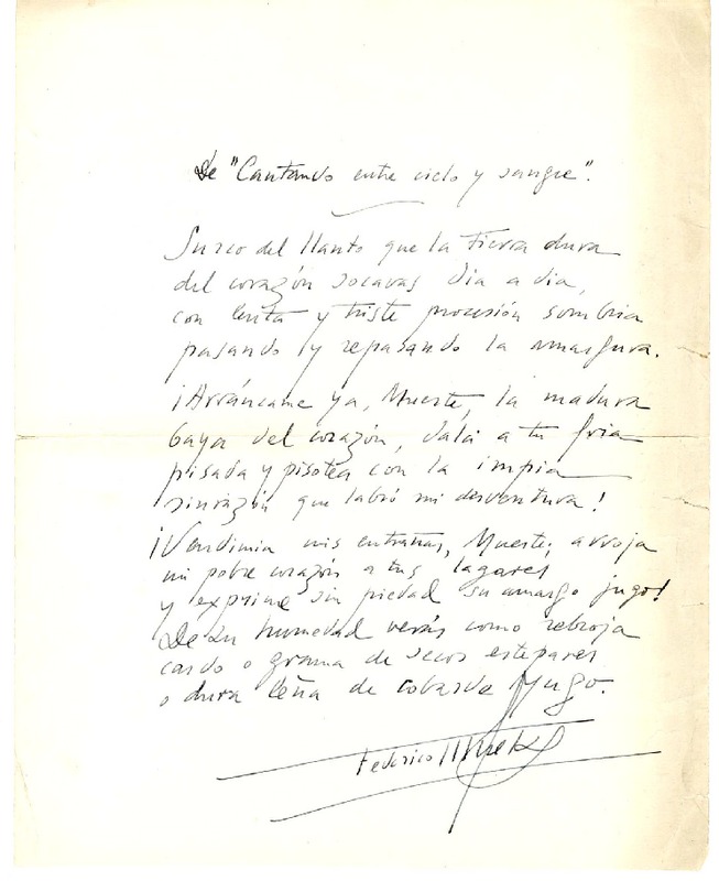 Cantando entre cielo y sangre [manuscrito] Federico Muelas.