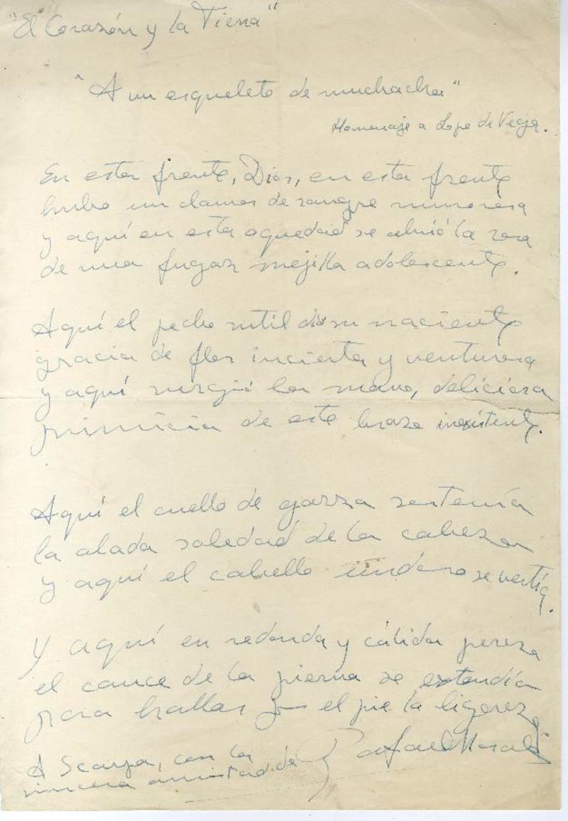 El corazón y la tierra : A un esqueleto de muchacha[manuscrito] / Rafael Morales.