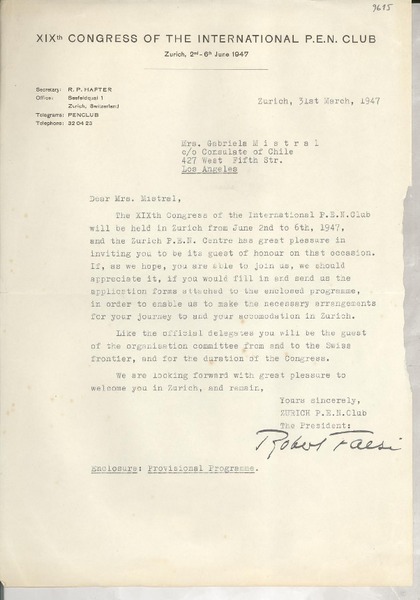 [Carta] 1947 Mar. 31, Zurich, [Switzerland] [a] Gabriela Mistral, Los Angeles, [EE.UU.] [manuscrito] Robert Faesi.