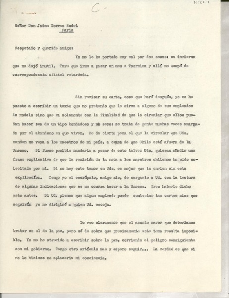 [Carta] 1933 jul. 10, París, [Francia] [a] Gabriela Mistral, Universidad de Puerto Rico, Río Piedras, [Puerto Rico] [manuscrito] Jaime Torres Bodet.
