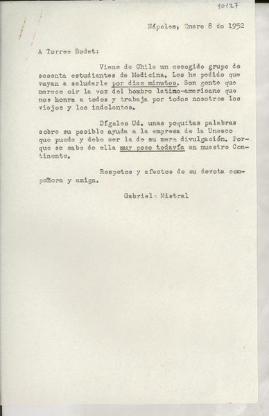 [Carta] 1952 ene. 8, Nápoles, [Italia] [a] Torres Bodet [manuscrito] Gabriela Mistral.