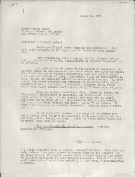 [Carta] 1951 mar. 11, Rapallo, [Italia] [a] Jaime Torres Bodet, París, [Francia] [manuscrito] Gabriela Mistral.