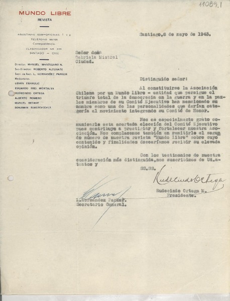 [Carta] 1943 mayo 8, Santiago, [Chile] [a] Gabriela Mistral [manuscrito] Rudecindo Ortega M., L. Hernández Parker.