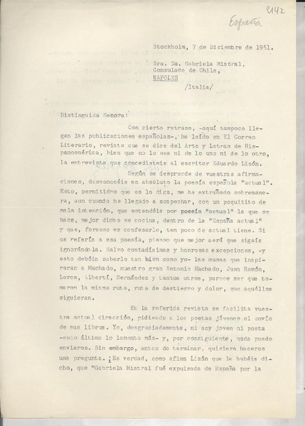 [Carta] 1951 dic. 7, Estockholm, [Suecia] [a] Gabriela Mistral, Nápoles, Italia [manuscrito] Víctor Angohe.