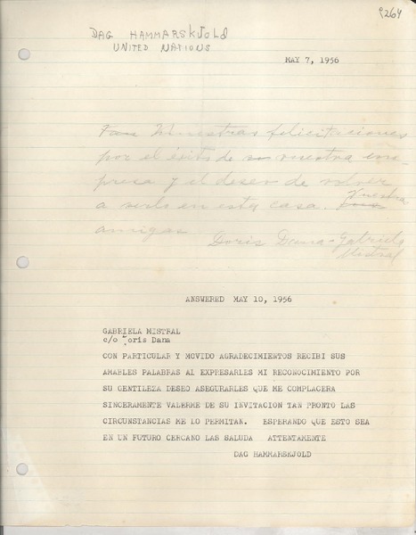 [Carta] 1956 May 10, [EE.UU.] [a] Gabriela Mistral [manuscrito] Dag Hammarskjold.