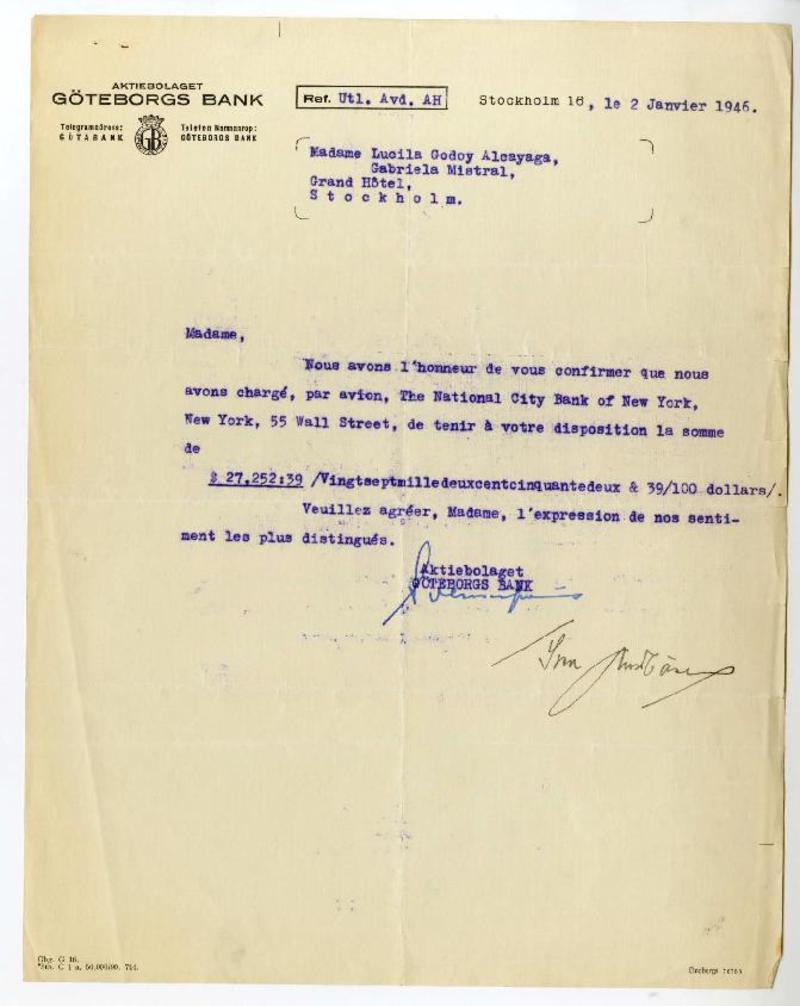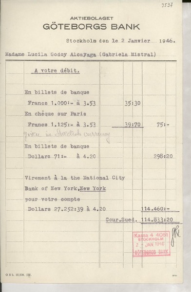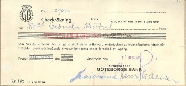 [Recibo] 1946 janv. 2, Stockholm, [Suecia] [a] Lucila Godoy Alcayaga [manuscrito] Göteborgs Bank.