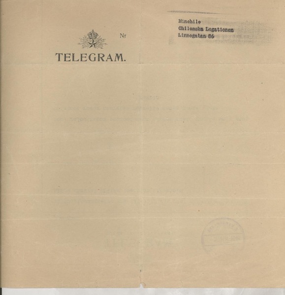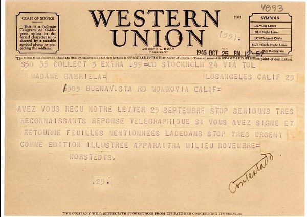 [Telegrama] 1946 oct. 25, Stockholm, [Suecia] [a] Gabriela Mistral, Monrovia, California, [EE.UU.] [manuscrito] Northstedts.