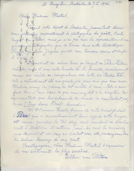 [Carta] 1946 janv. 7, Stockholm, [Suecia] [a] [Gabriela] Mistral [manuscrito] Ellen von Platen.