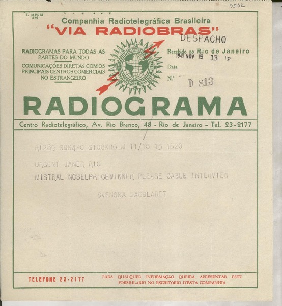 [Telegrama] 1945 Nov. 15, Stockholm [a] Gabriela Mistral, Río de Janeiro [manuscrito] Svenska Dagbladet (Periódico sueco).