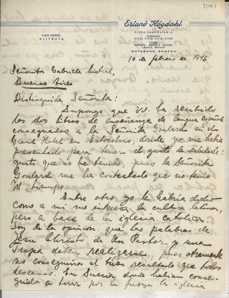 [Carta] 1946 feb. 10, Göteborg, Sweden [a] Gabriela Mistral, Buenos Aires, [Argentina] [manuscrito] Erland Högdahl.