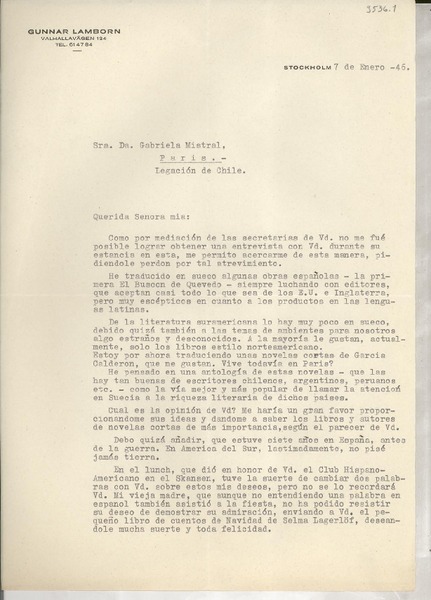 [Carta] 1946 ene. 7, Stockholm [a] Gabriela Mistral, Paris [manuscrito] Gunnar Lamborn.
