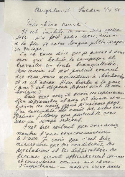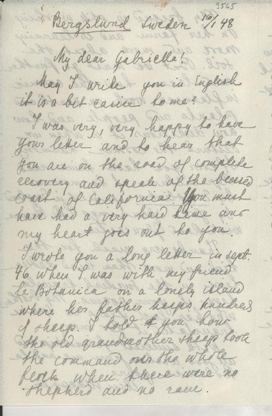 [Carta] 1946 avril 2, Bergslund, Sweden [a] [Gabriela Mistral] [manuscrito] Elin Wagner.