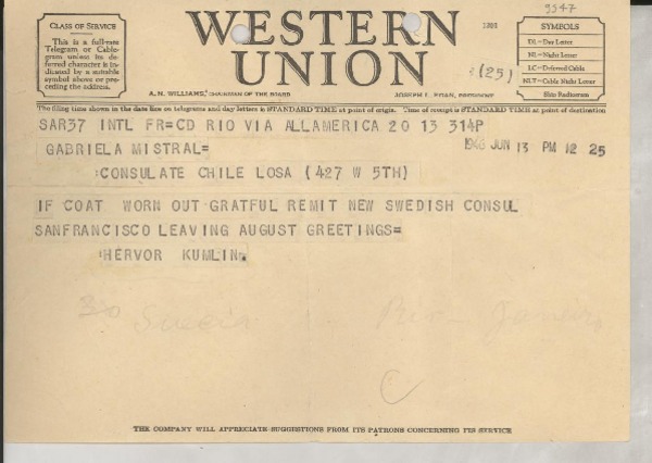 [Telegrama] 1946 junho 13, Rio, [Brasil] [a] Gabriela Mistral, [Los Angeles], [EE.UU.] [manuscrito] Hervor Kumlin.