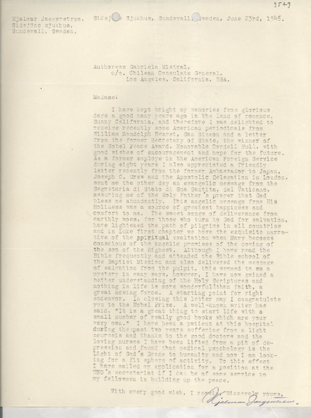 [Carta] 1946 June 23, Sundsvall, Sweden [a] Gabriela Mistral, Los Ángeles, California, USA [manuscrito] Hjalmar Jaegerstrom.