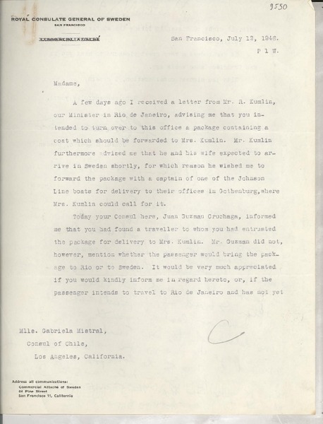 [Carta] 1946 June 12, San Francisco, [Estados Unidos] [a] Gabriela Mistral, Los Ángeles, California [manuscrito] Cónsul General de Suecia en San Francisco.