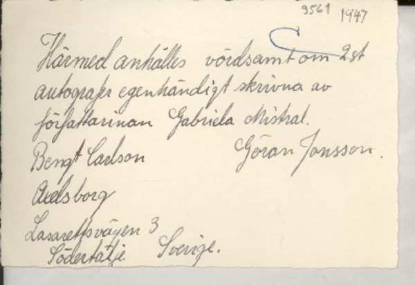 [Tarjeta] [1947], Sodertalje, Sverige, [Suecia] [a] Gabriela Mistral [manuscrito] Bengt Carlson, Jansson Göran.