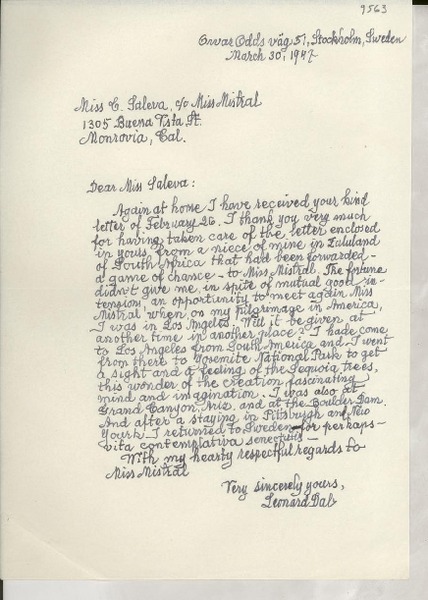 [Carta] 1947 Mar. 30, Stockholm, Sweden [a] C[onsuelo] Saleva, Monrovia, Calif., [EE.UU.] [manuscrito] Leonard Dal.