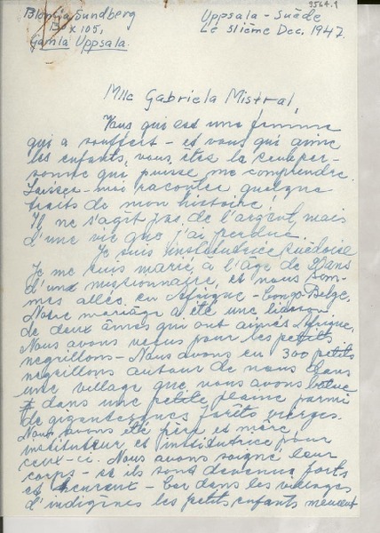 [Carta] 1947 déc. 31, Uppsala, Suède [a] Gabriela Mistral [manuscrito] Blenda Sundberg.